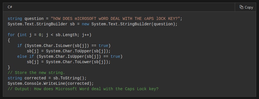 string question = "hOW DOES mICROSOFT wORD DEAL WITH THE cAPS lOCK KEY?";