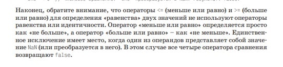 Наконец, обратите внимание, что операторы <= (меньше или равно) и> = (больше или равно) не полагаются на операторы равенства или строгого равенства для определения того, являются ли два значения «равными». Вместо этого оператор «меньше или равно» просто определяется как «не больше», а оператор «больше или равно» определяется как «не меньше».