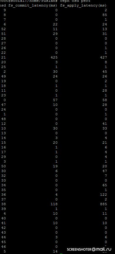ЧТо показывает ceph osd perf? А то мне покоя это не даст.