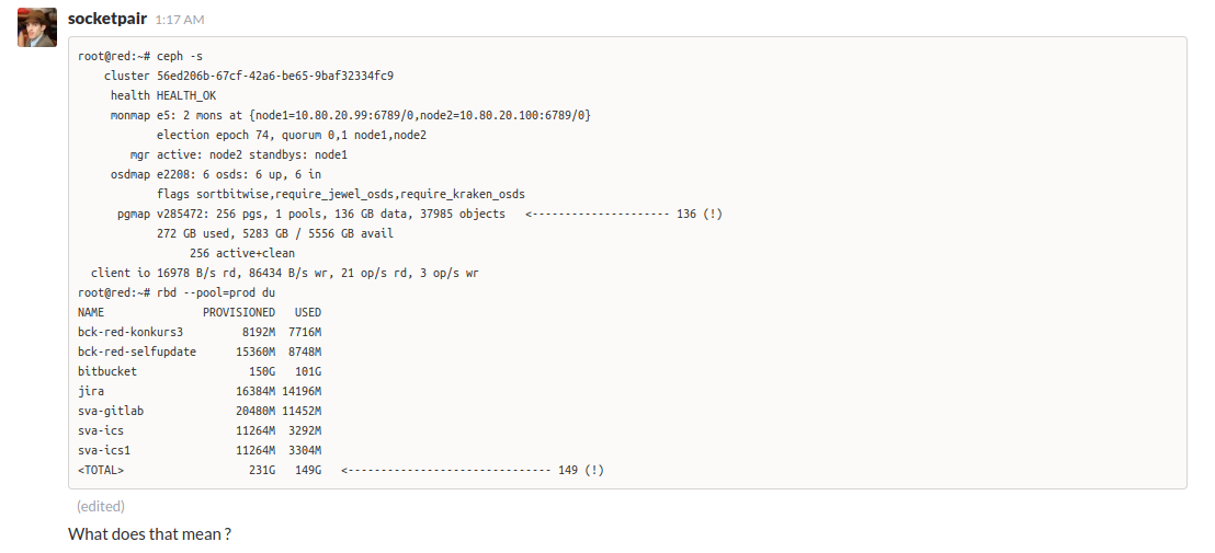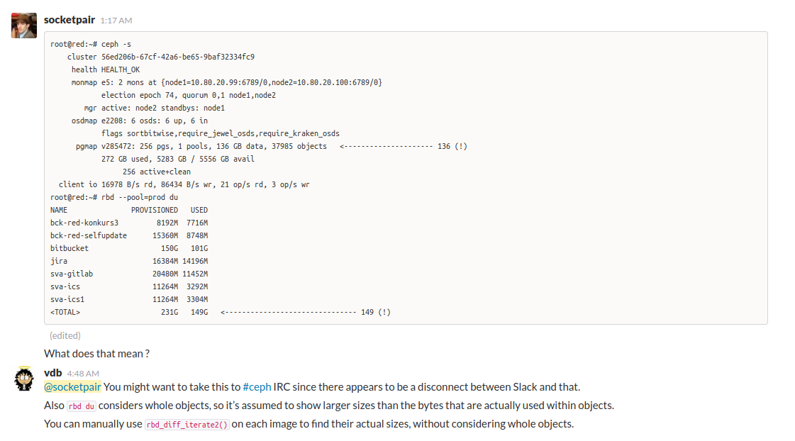 2) есть предположение, что такое поведение - это следствие какой-то кривизны в CRUSH. уважаемые мэтры, если вы видите здесь что-то неадекватное - скажите мне, пожалуйста. мне не нравится например строчка "device 36 device36", но ее удаление и перекомпиляция/загрузка крашмапы не удаляют упоминание. Ранее был osd 36, который по процедуре стандартно выкинули.