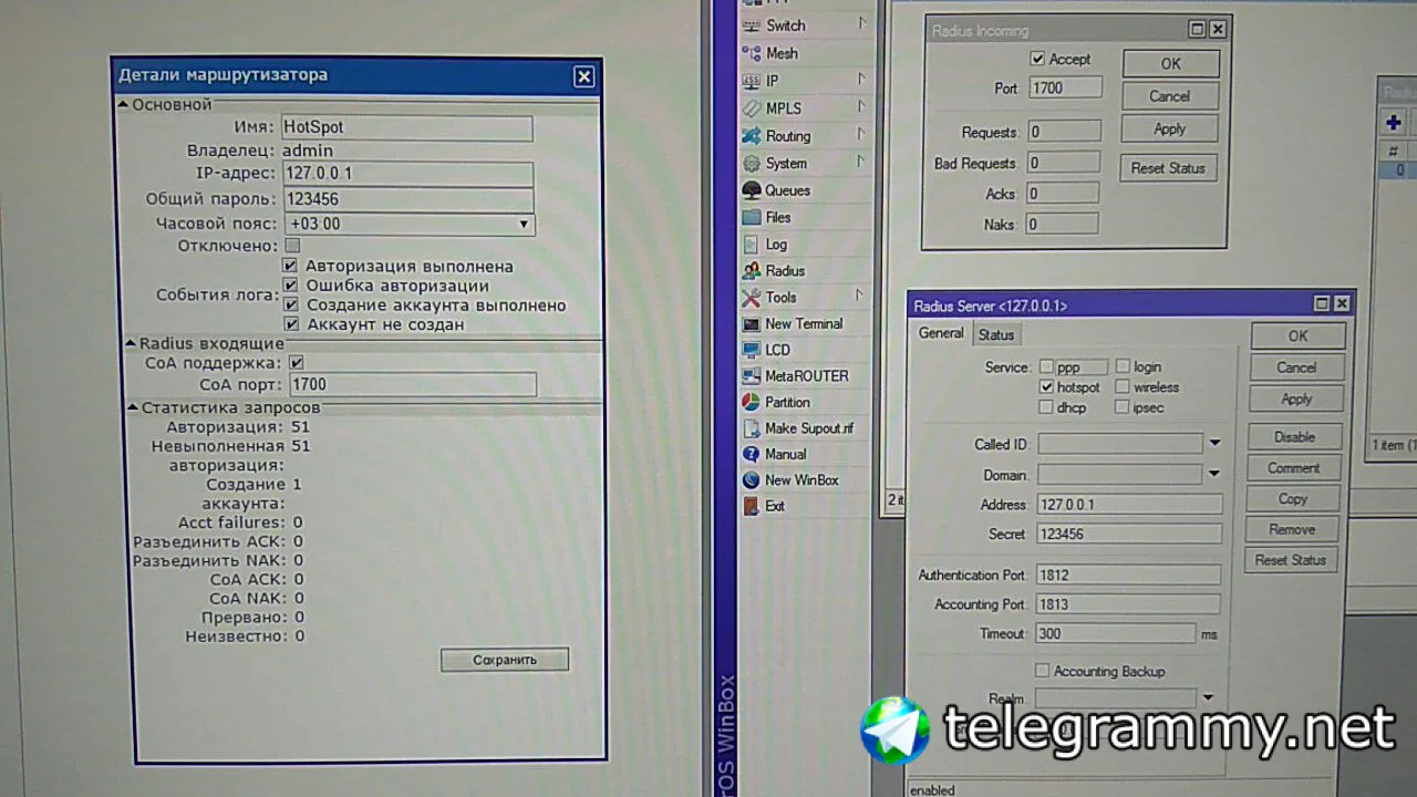 потом выполни команду /radius add service=hotspot address=127.0.0.1 secret=123456