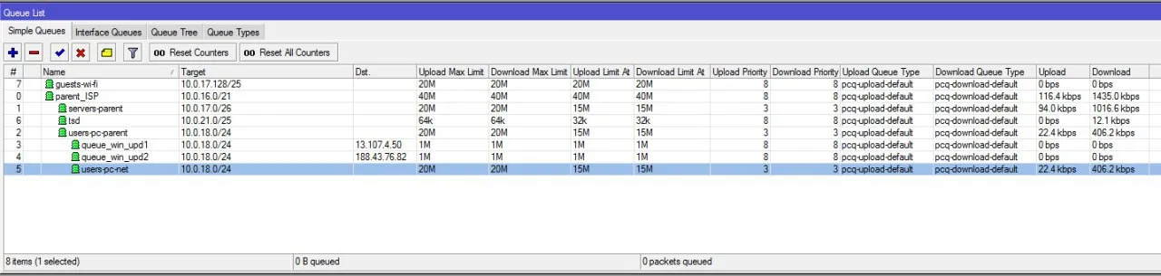 Есть дерево простых очередей. Как вы думаете почему в сети 10.0.17.0/26 нормально работает только Download ограничения? Upload более 2Mbit/s не поднимается.