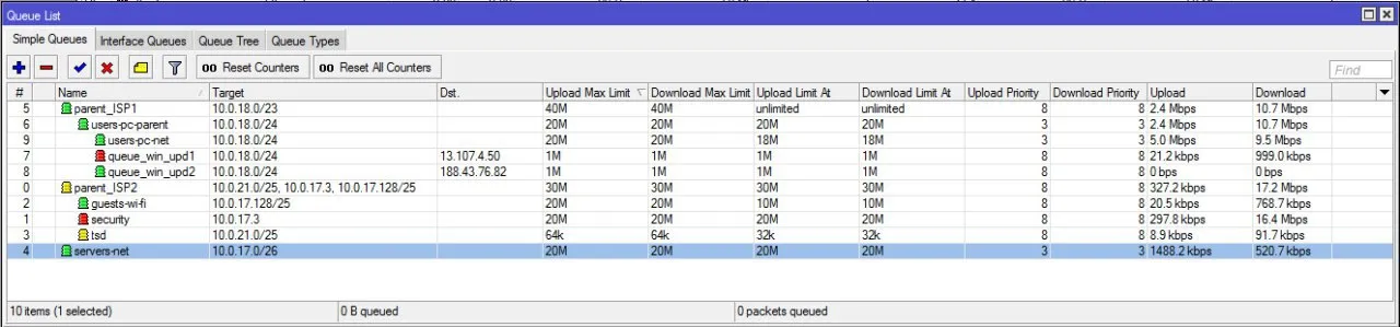 Есть два провайдера ISP1 - 40Mbit/s. Есть сеточка 10.0.16.0/21. Сделал очередь, добавил в неё две дочки 10.0.18.0/24, 10