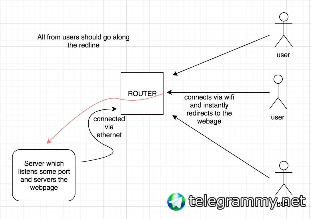 схема выше: чувак подключается через вайфай к роутеру и его сразу же редиректит на сервак(который подключен к роутеру через ethernet)