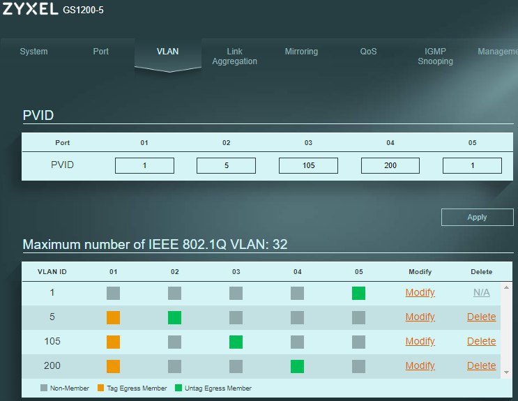 Господа, добрый день. взял свич на пробу и столкнулся с проблемой, не могу никак получить ip самому свичу по dhcp, либо достучаться статикой через eth1. С Микротика отдаю тегированные 5,105,200. Зайти на свич получается только через eth5 в данном случае, спасибо