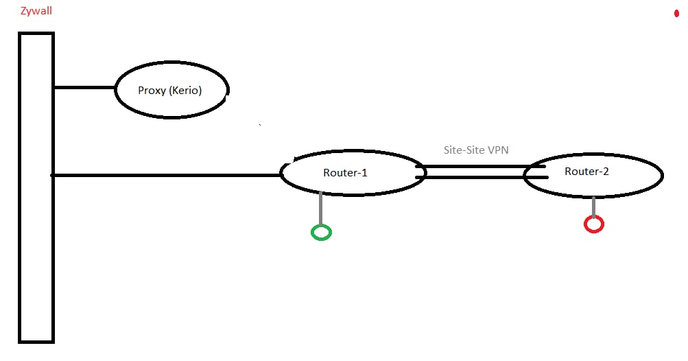 Клиенты (зеленые) подключенные к роутеру-1 могут выходить в интернет без проблем как через прокси, так и напрямую (если разрешить)