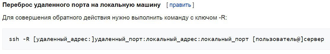 ssh -R [удаленный_адрес: ]удаленный_порт:локальный_адрес:локальный_порт [пользователь@]сервер