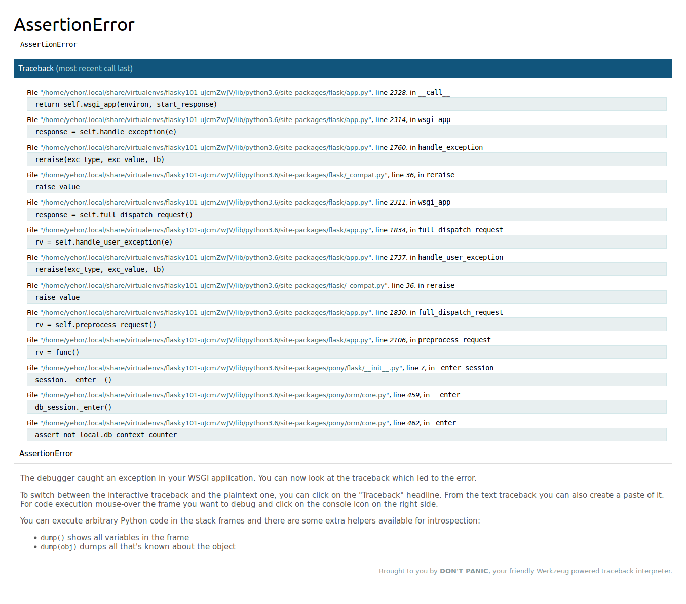 @aerok : Ah, thanks. Your question solved it. Turned out I was using an old database created with an icon = Required(string), but in the current, that one was commented. So the first line about was an error from Pony, but the second one from SQLite. My bad, but perhaps the first error could clarify that the attritue icon is in the database but not in the declaration... or maybe that would be difficult to implement. Anyway, thanks.