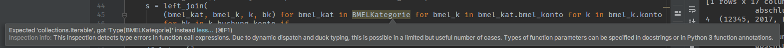 Alexey and while we're at it, back in 2016 there was a brief discussion on the topic of type annotation here in the Telegram group. I've been stumbling about that too. In my current project I'm (for the first time) type-annotating each and every function in order to avoid type errors from the outset. PyCharm has a great integration of type checking and reports missing annotations and wrong annotations. This is what I get for PonyORM entities (BMELKategorie in this case). I think it would be a nice improvement of PonyORM if it would deliver the entities with an inbuilt iterator class, e.g. `Iterable`