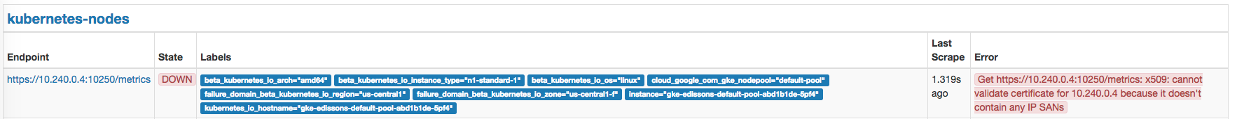 все ок, разобрался, в GKE оказывается самоподписаные сертификаты и надо скипать их проверку в конфиге прометеуса
