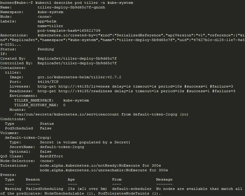 Кто нибудь сталкивался с ошибкой при установке Helm, не разворачивается pod tiller-deploy-xxxxxxxx, висит на pending ?