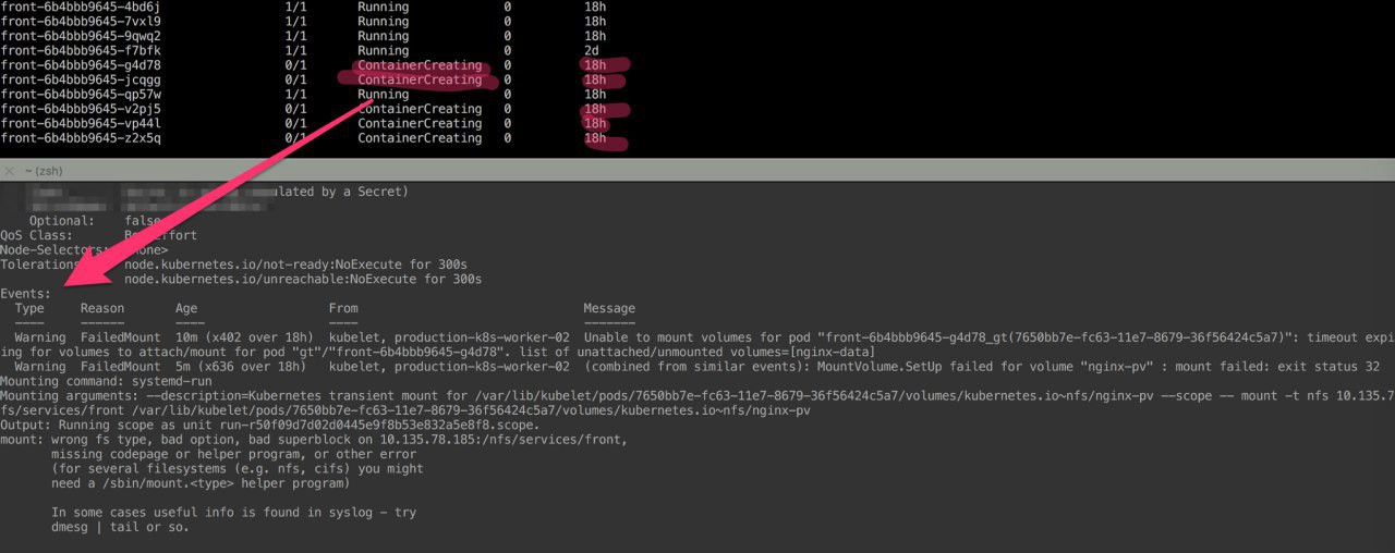 а успешные маунты были? похоже что проблема в nfs а не в кубере