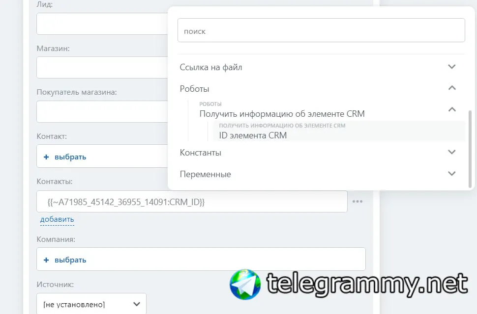 2. Создать элемент CRM. Здесь создаете сделку и в поле Контакты указываете доп. результат из робота выше.