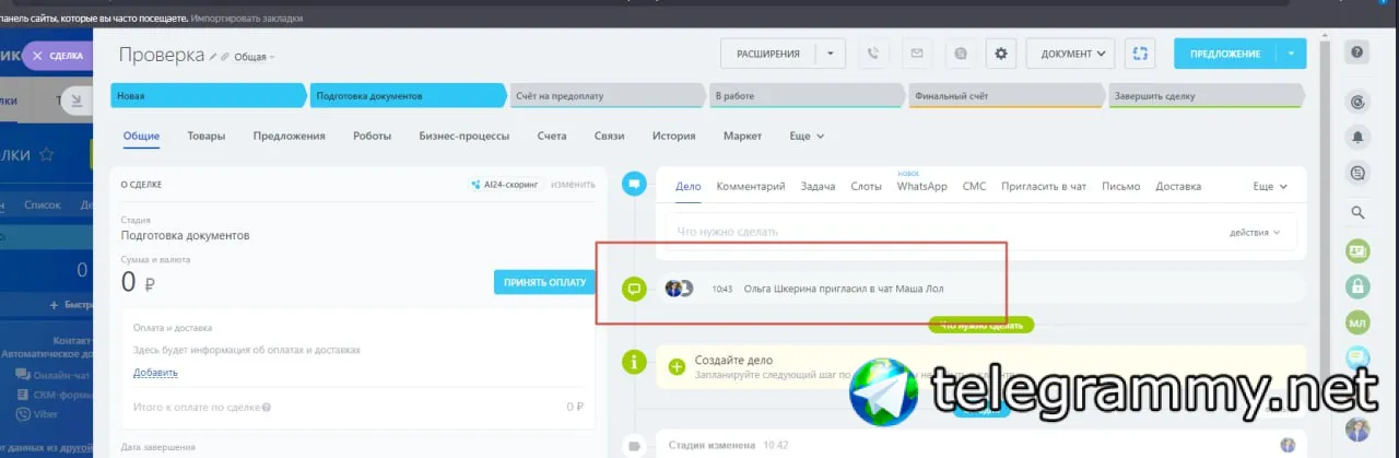 В роботах нашла только создание группового чата, но это не то. Нужен чат именно по сделке, как-то можно к нему прицепиться?