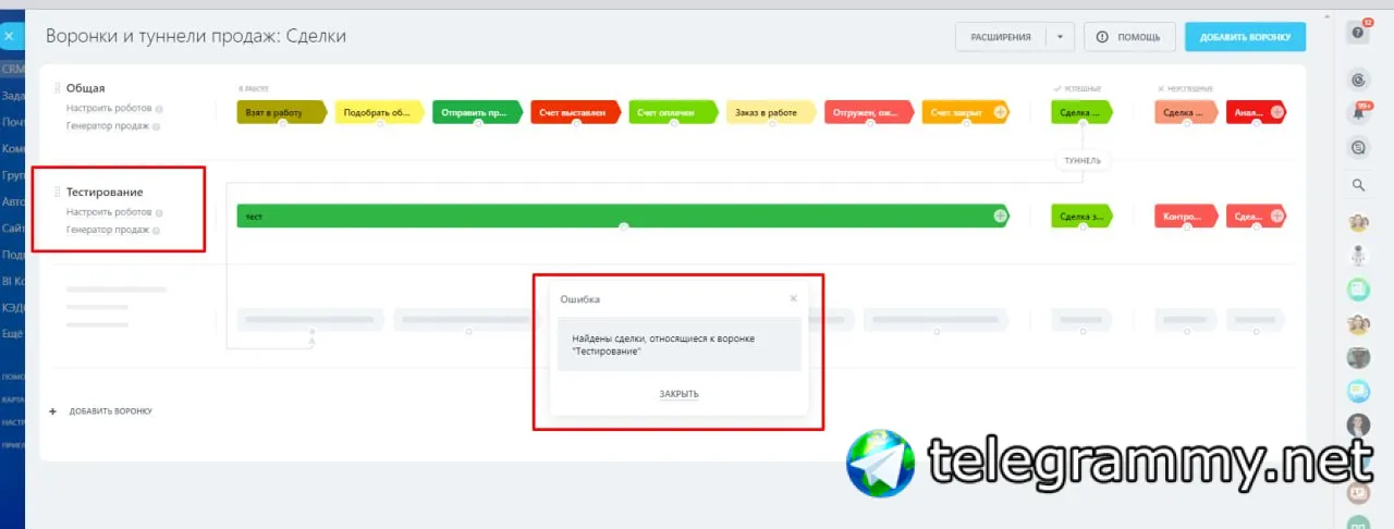 подскажите, пожалуйста, хочу удалить тестовую воронку в сделках, но Битрикс не дает. Хотя в этой воронке нет никаких сделок