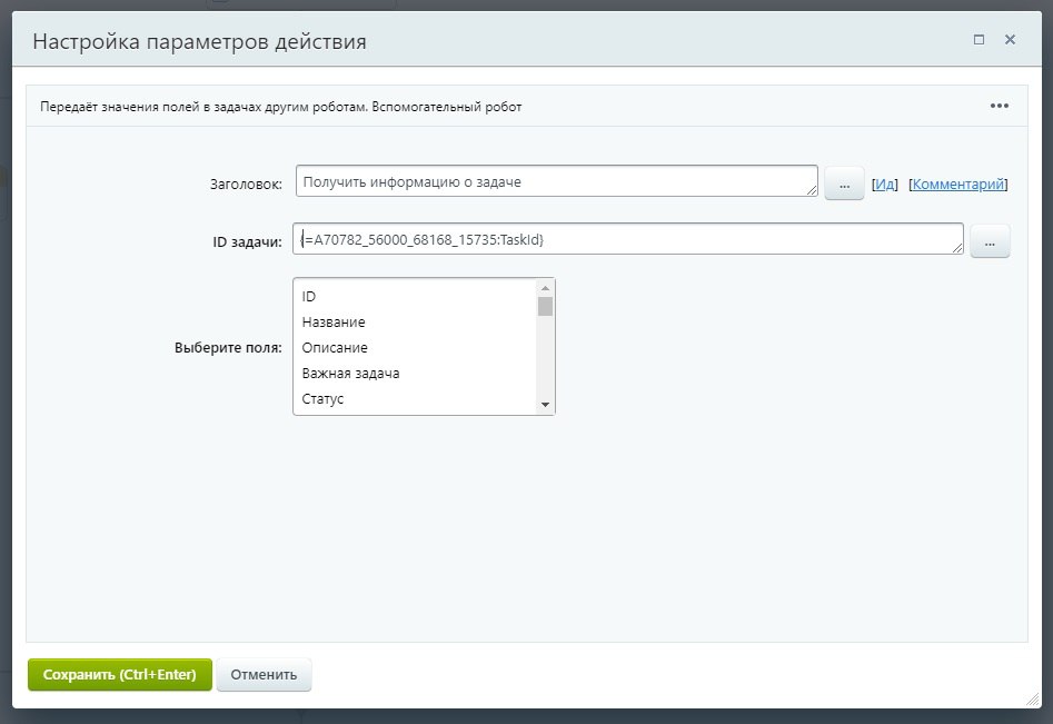 А не подскажешь, как правильно пользоваться вспомогательными роботам, нет опыта в них. Это скрин настройки активити "Получить инфо по задаче"?
