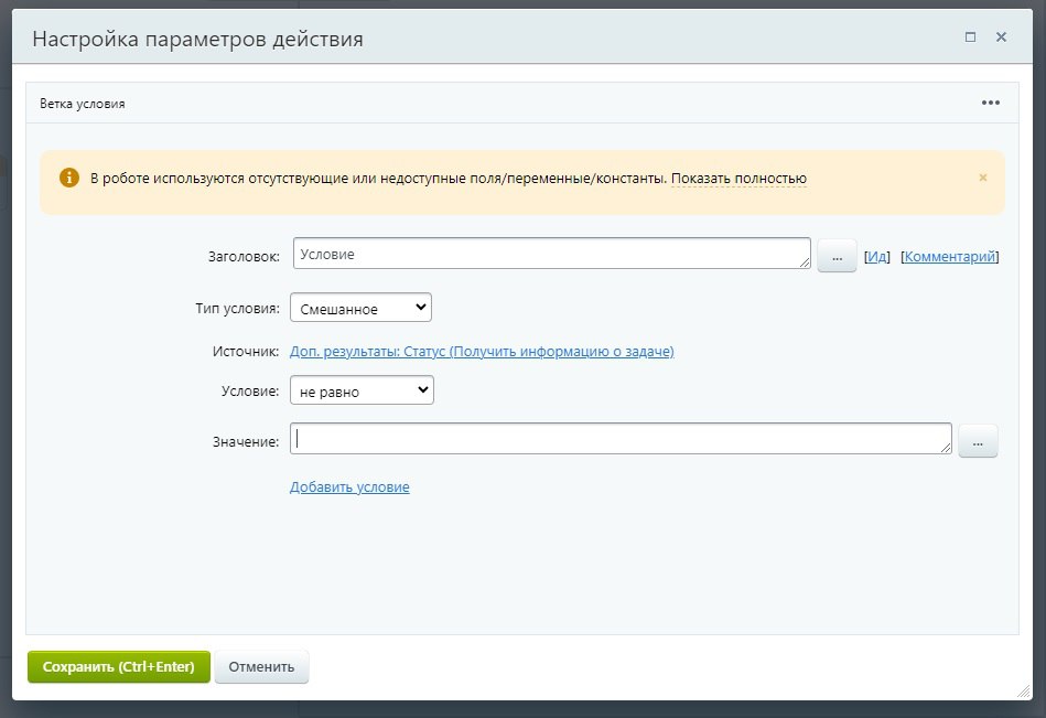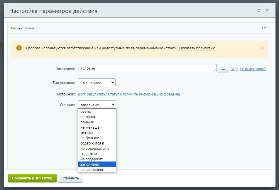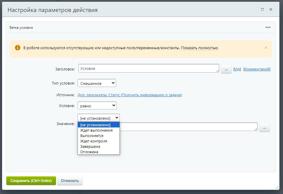 Извини, но я не понимаю где выбрать эти значения "завершена" или "ждет контроля". Выбрал "не равно" и появилось поле "значение", там не могу найти...