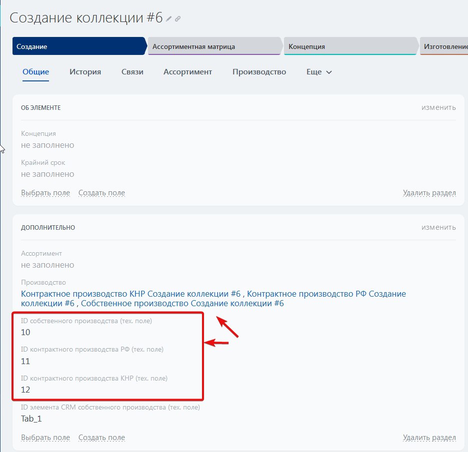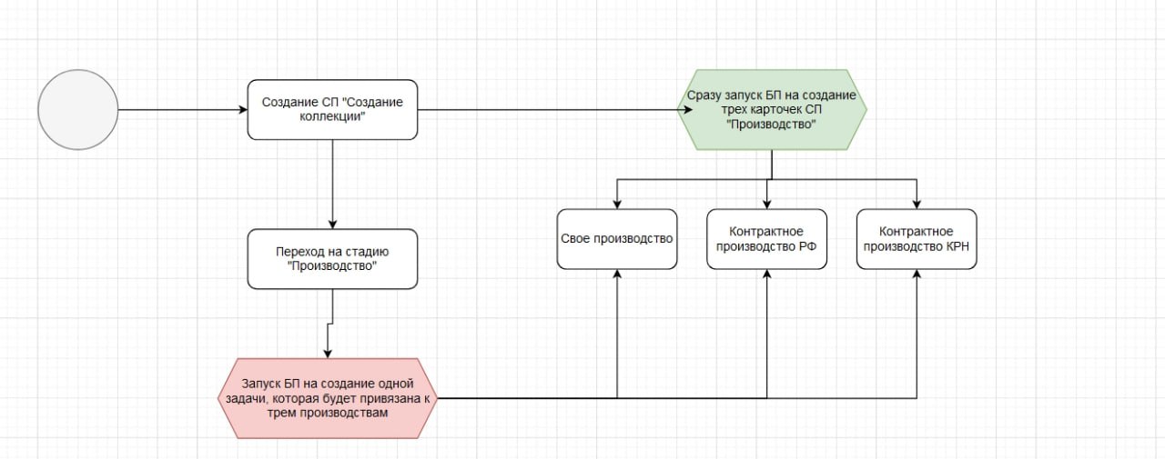 Как работает процесс: при создании СП "Создание коллекции" в другом СП (Производство) создается три карточки и при переходе СП "Создание коллекции" в стадию "Производство" нужно ставить задачу, которая будет привязана к трем элементам СП "Производство".
