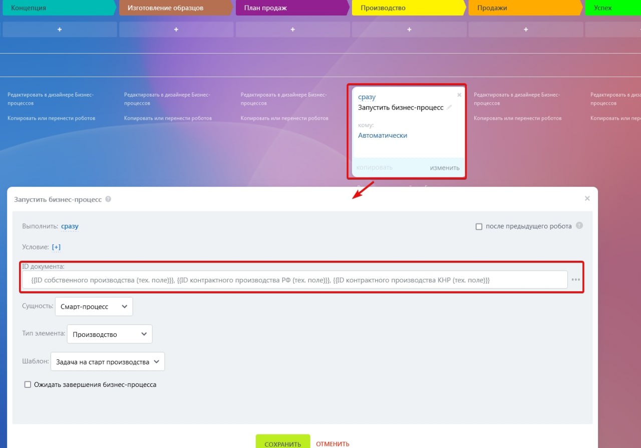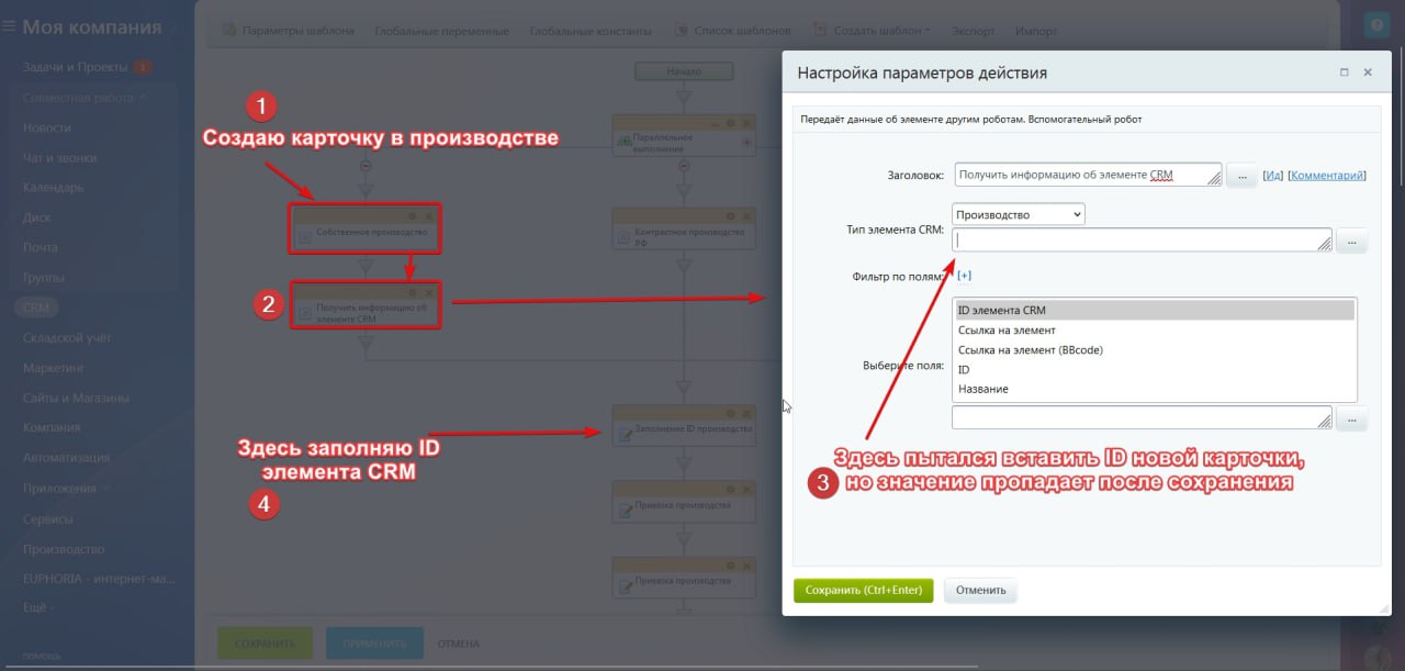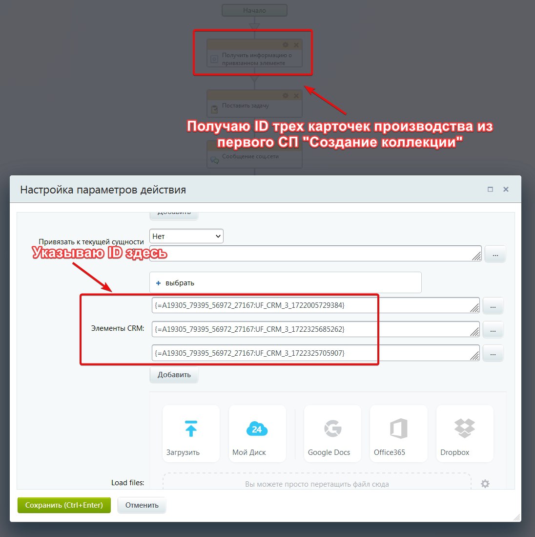 Сейчас при создании трех сп в производстве записываю ID в тех. поля. Пробую через запуск БП с указанием ID, не работает. Пробовал через ID элемента CRM, тоже не работает.