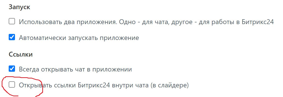 Здравствуйте. Присутствует такая проблема, в десктоп приложении windows при настройках, как на скрине, ссылки битрикс открываются в хроме, как и положено. Но через какое-то время начинают открываться в слайдере (при этом в настройках галочка остается снятой). Если поставить галку и обратно убрать (или перезапустить приложение), то снова начинает какое-то время работать, как надо, но потом снова начинает открываться в слайдере. Как можно избавиться от этой проблемы? В браузере естественно битрикс так-же авторизован.