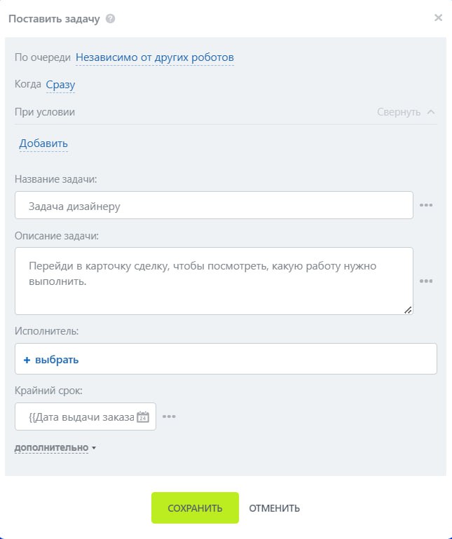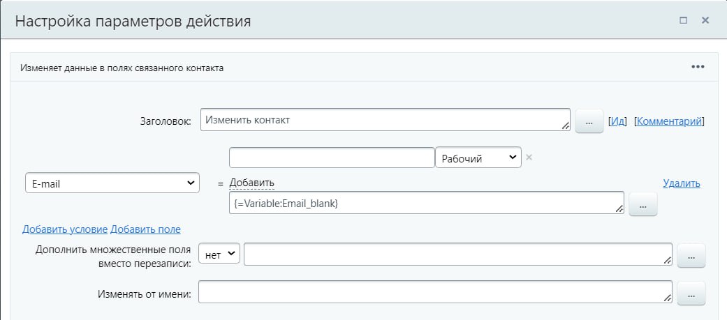 Но при настройке робота можно выбрать только контакт для привязки из предлагаемого списка (то есть один конкретный, а не переменную)
