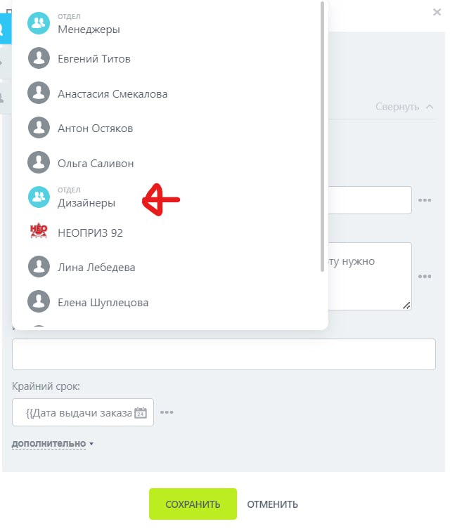 Пробую поставить в исполнитель отдел, не работает