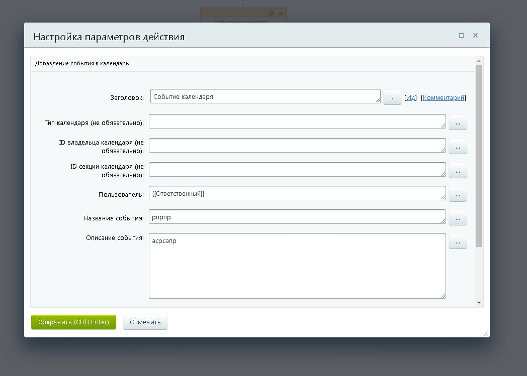 есть календарь группы в которой нужно при запуске бизнес процесса создавать 2 события в календаре, эти даты должны вставляться в календарь и выглядеть в формате периода чтоб можно было наглядно видно в какой период времени Пост в котором ведутся работы будет занят.