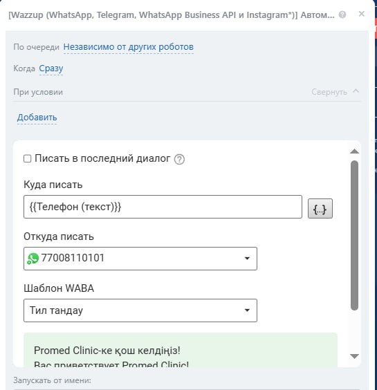 Создал робота ваззап для автомаической отправки сообщения но нужно чтобы он реагировал на первое сообщение в чате а то получается что клиент который вчера писал продолжит разговор сегодня и ему отправляются автоматические не нужные сообщения