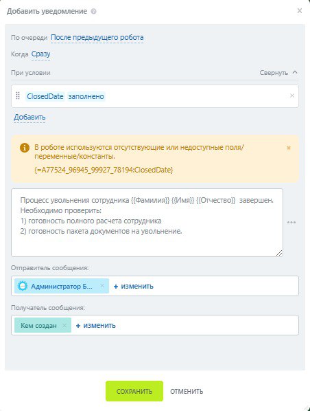 Добрый день, не работает робот в смарт-процессе. Ошибка: В роботе используются отсутствующие или недоступные поля/переменные/константы.