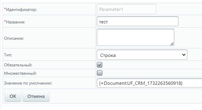 добрый день. как поле "значение по умолчанию" заполнить значением из поля карточки сделки из которой БП запускается?