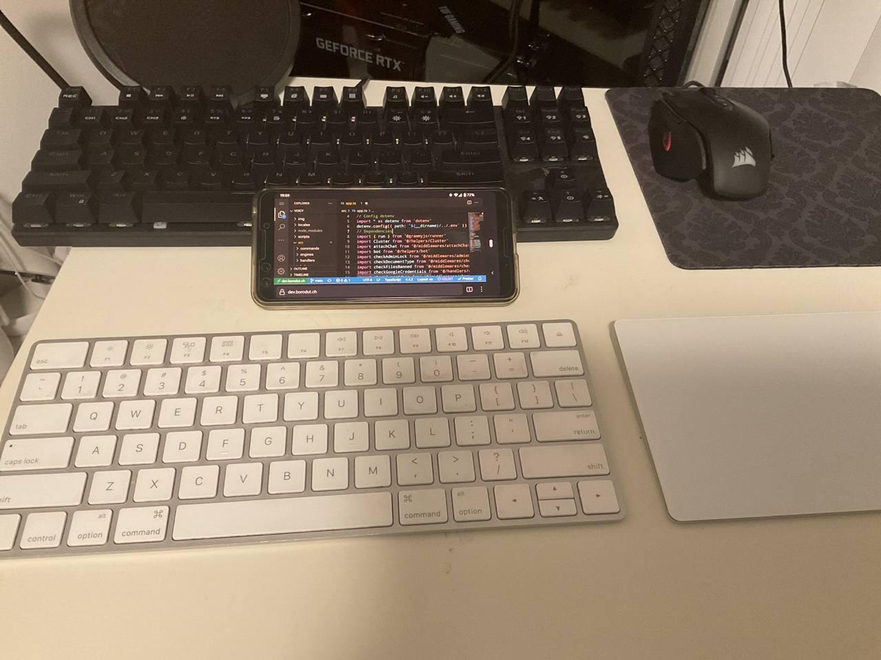 Да, я запустил VSC у себя на Pixel 3. Да, я подключил к нему яблочные клавиатуру и трекпад по блютусу. Да, это все еще удобнее сетапа с предыдущей картинки.