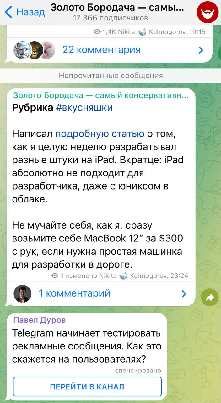 . У меня пока чисто. #стартапдня пора пилить свой форк телеги с адблоком 😈
