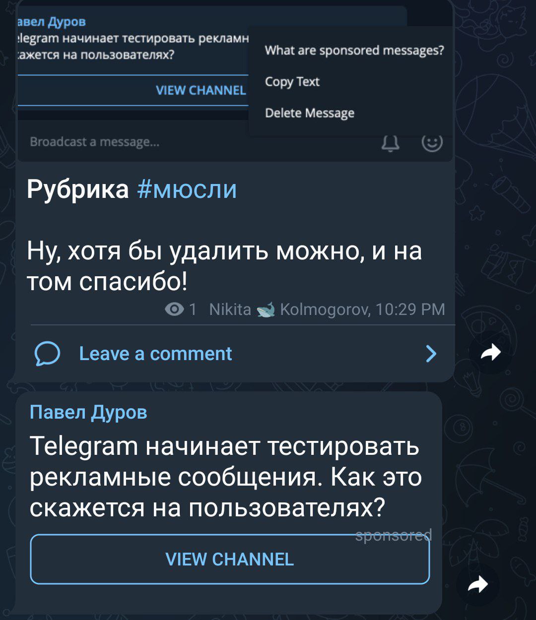 На этом канале я делюсь своими мыслями под хештегом #мюсли, прогрессом проектов под хештегом #проекты, удивительными фактами под хештегом #ничеси, всякими вкусностями под хештегом #вкусняшки. Есть еще несколько хештегов, но они совсем для ценителей.