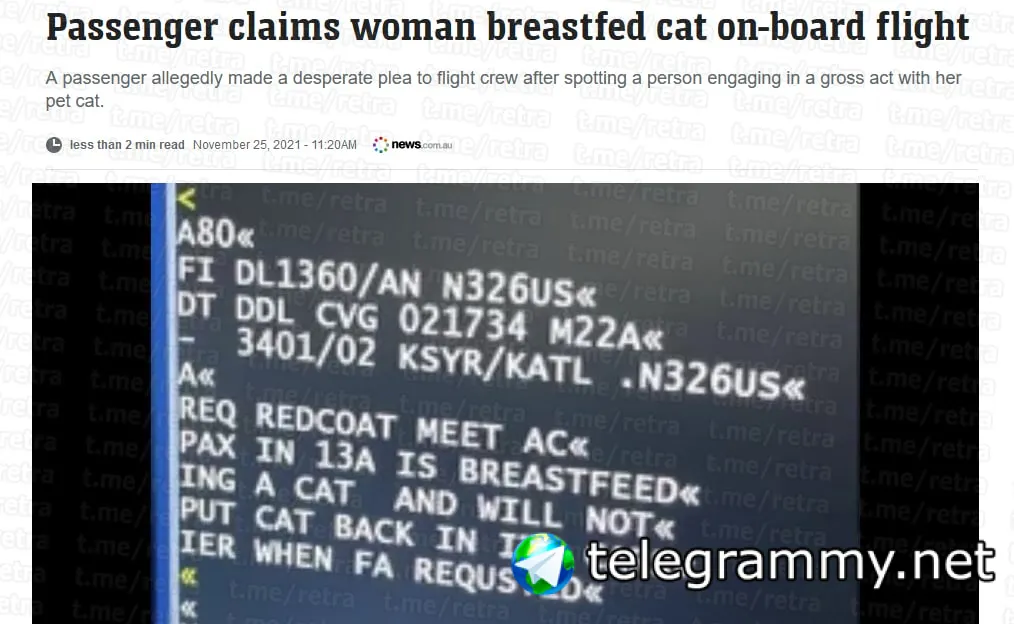 В рапорте рейса, направляющегося в Атланту, сказано, что женщина начала кормить грудью свою кошку и отказывалась останавливаться, несмотря на неоднократные просьбы экипажа.