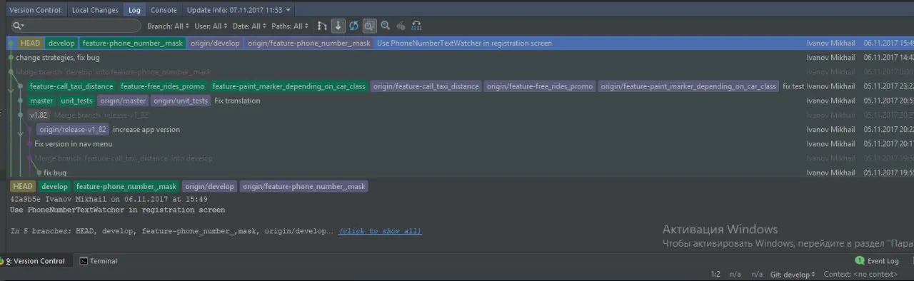 и вы утверждаете, что если вы внизу справа сделаете New Branch, и введетё имя ветки, которое ещё не используется, то в локальном репозитории новая ветка создастся на на том коммите, на котором висит develop?