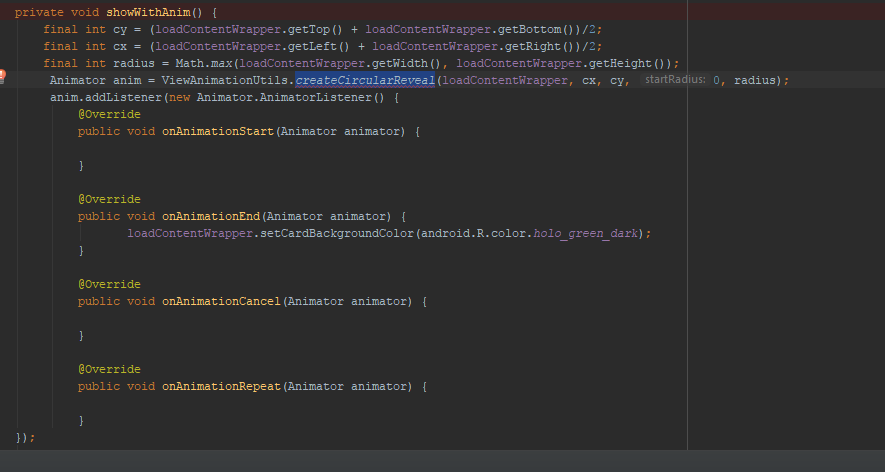 Всем приве... Ребзя... напраьте ход мысле плз... Хочу сделать анимацию появления карточки от угла... В разметке есть ФреймЛейоут в котором есть кардВью... Я ставлю на него createCircularReveal стартую анимацию но ничего не происходит... не могу понять почему так... метод отрабатывает смотрел в дебагере, но самой анимации не происходит 😩 Вот код метода...