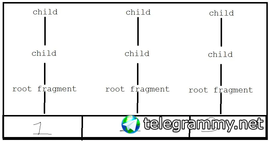есть BottomNavigationView с 3 кнопками. При нажатии на любую открывается rootFragment(получается всего 3 rootFragment'а). ну и дальше из rootFragment можно уйти внутрь в child а из child в другой child. например всего 2 уровня(2 child).