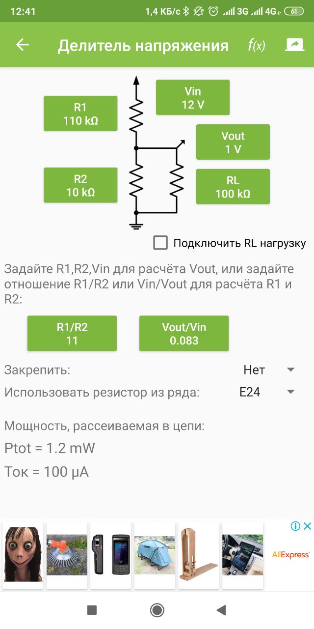 Делитель рассчитывается так, чтобы максимальное напряжение на входе ADC не превышало 1 В