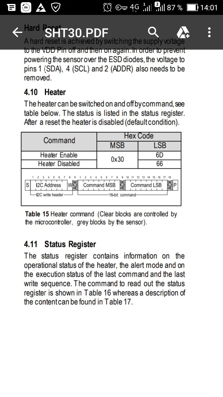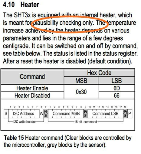 Всем привет. Может в курсе кто? Есть датчик температуры и влажности sht31. У него есть встроенный нагреватель на случай конденсата. Что то в даташите не нашел или так смотрел. Этот подогрев сам включается при каких то условиях или его нужно программировать?