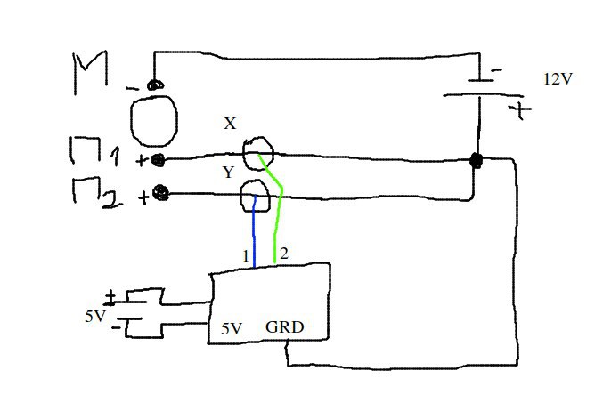 У меня есть мотор, с тремя проводами (М, П1, П2) - (Минус, Плюс1, Плюс2), один должен быть соединен с минусом питания, два другие - с плюсом, в зависимости от того на какой провод пойдёт плюс в ту сторону и покрутится двигатель. Правильно ли я нарисовал схему?