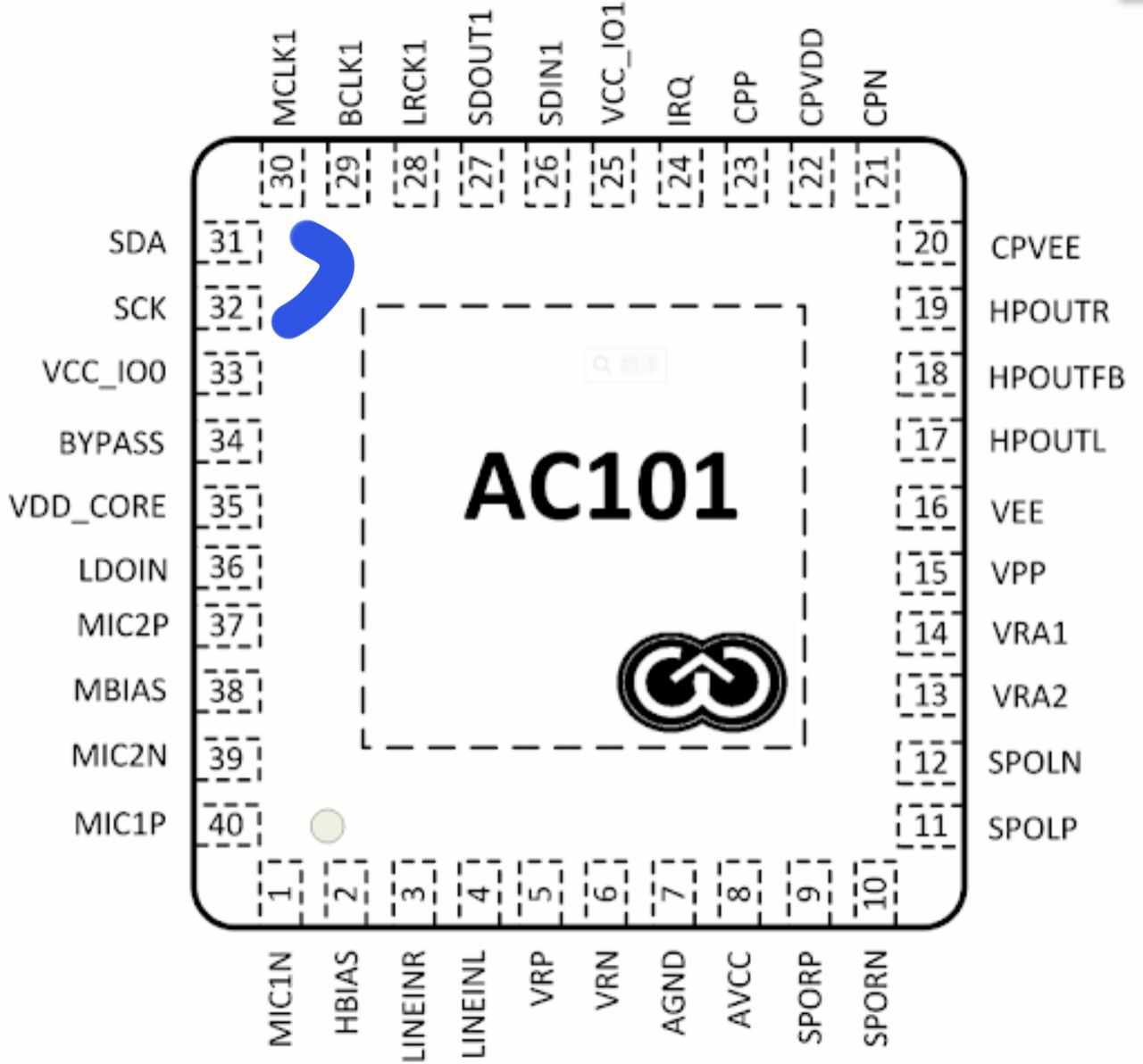 31 и 32 это в даташите ноги кодека) собственно он и сидит где-то на ножках esp, возможно на 21/22, в даташите вам видимо решили не говорить дабы вы не стали использовать эту линию в своих целях чтобы не нарушить обмен esp-ac101... Думаю так... Так что если надо, организовывайте i2c на других доступных ножках