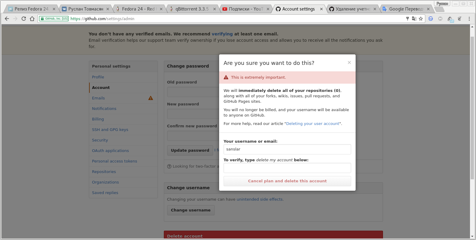 при удаление аккаунта на гитхабе просит ввести ник