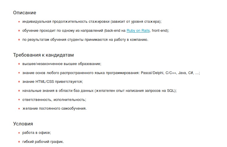 Когда я устраивался, я пришел пустой на стажировку. Меня спросили про проекты, которые я писал. Я сказал, что юзая гемы я делал небольшие тулзы и писал небольших ботов. Спросили знаком ли я с js html, пошутили про php (и я рассказал им крутую историю про php 4.2 в мои 14 лет или какая там версия была 7 лет назад) спросили что я знаю про HTTP, знаю ли я другие протоколы, типы данных, SSL всё.