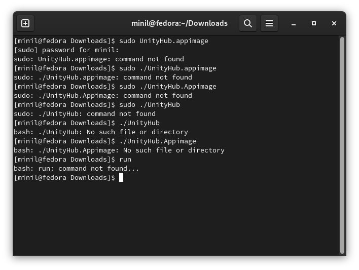 <pre>[minil@fedora Downloads]$ ./UnityHub.AppImage