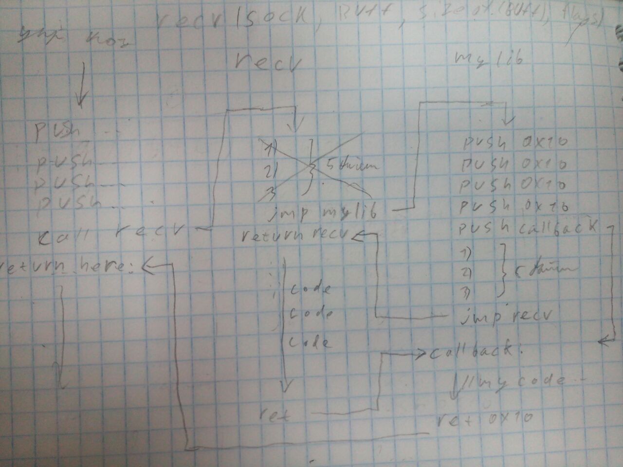 Хотя есть конечно небольшой подвох, управление не сразу перейдет на коллбэк, а на код, который подсунет новый адрес возврата (оригинальный адрес возврата recv()) и только потом вызовет функцию на плюсах