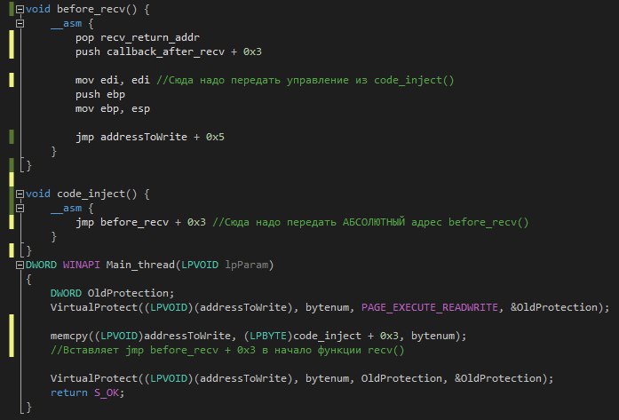 вот ты напишешь int _stdcall hook_recv(int, char*, int, int) { }