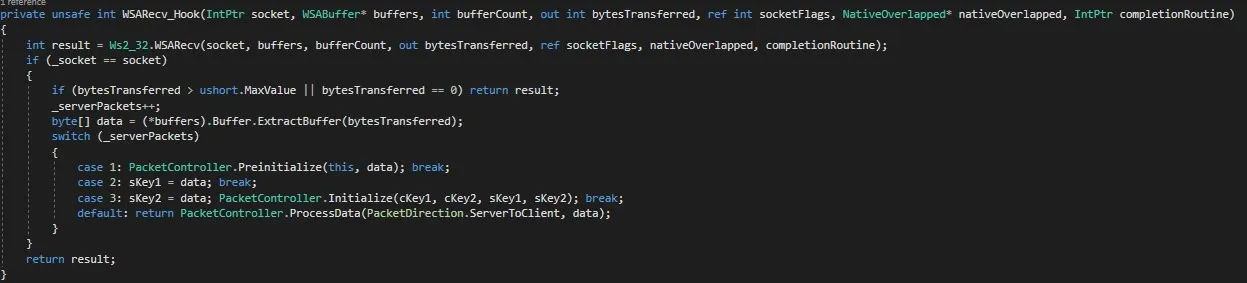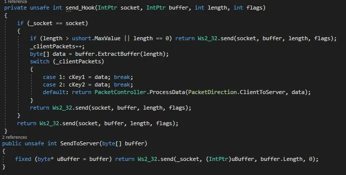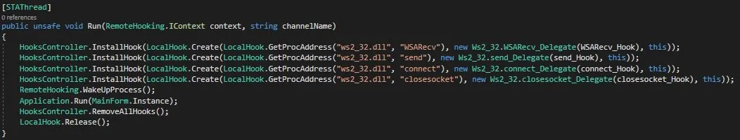 Ws2_32.send_Delegate send = LocalHook.GetProcAddress("ws2_32.dll", "send").ToDelegate<Ws2_32.send_Delegate😠);