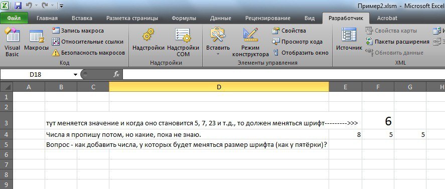 я составляю таблицу-программу в екселе, но сейчас конкретная задача - сделать так, чтобы когда производились расчёты в ячейке F3, определённые числа менялись в размере шрифта.