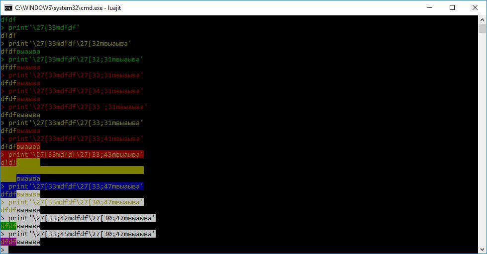 print(string.char(27,91,48,109)) -- возвращаем настройки обратно