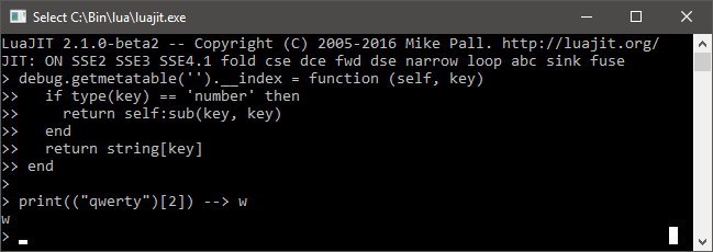 debug.getmetatable('').__index = function (self, k) return type(k) == 'number' and self:sub(k, k) or string[key] end